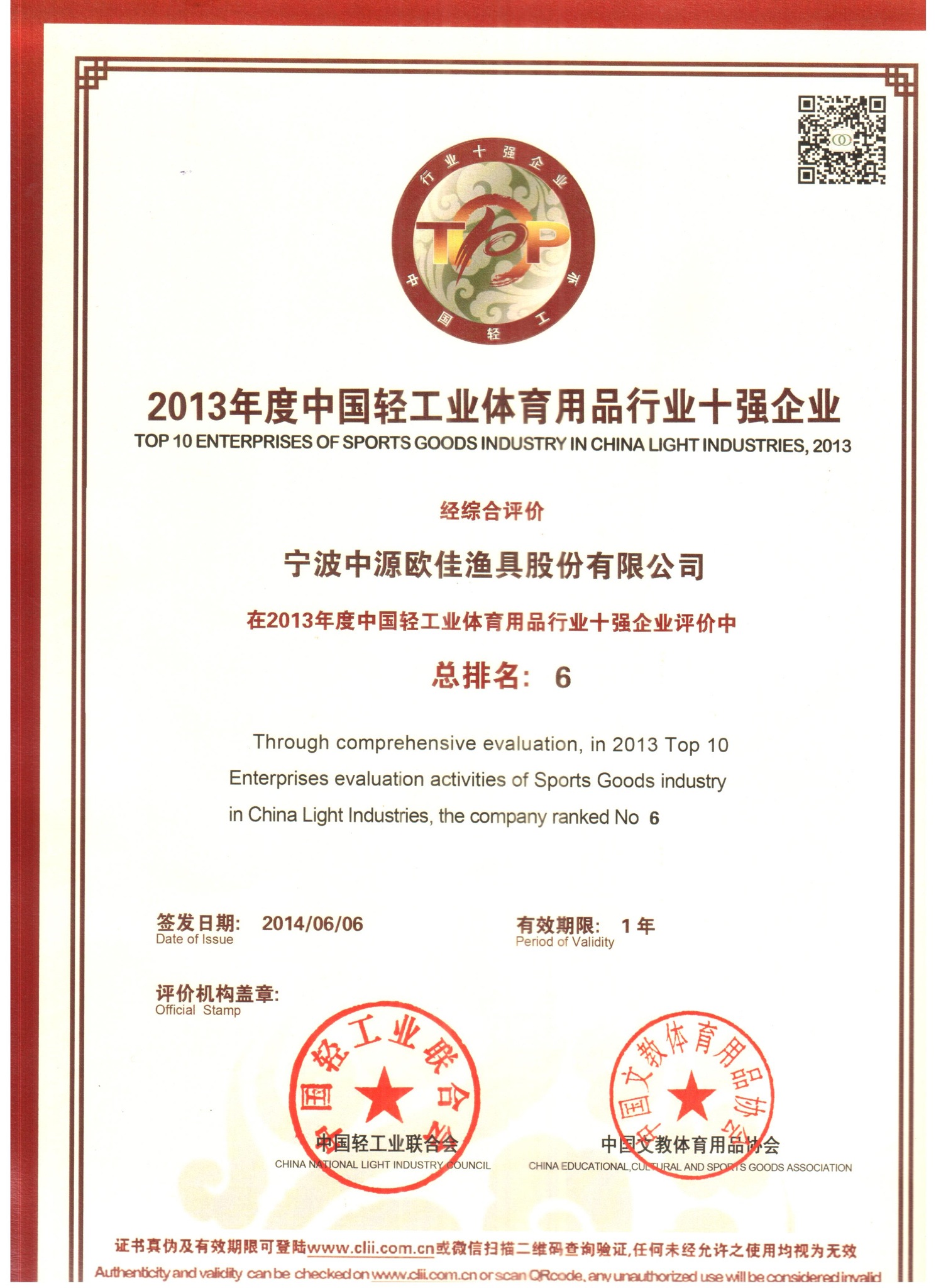 2013年輕工業(yè)體育用品十強(qiáng)