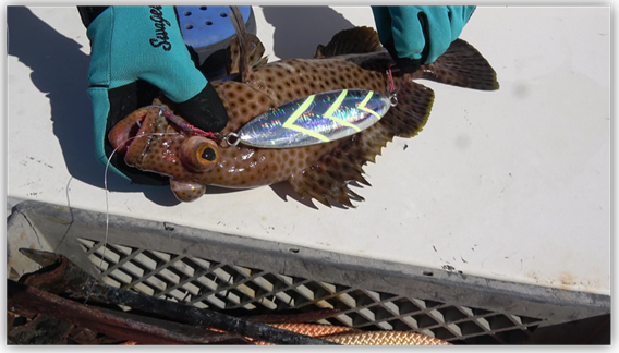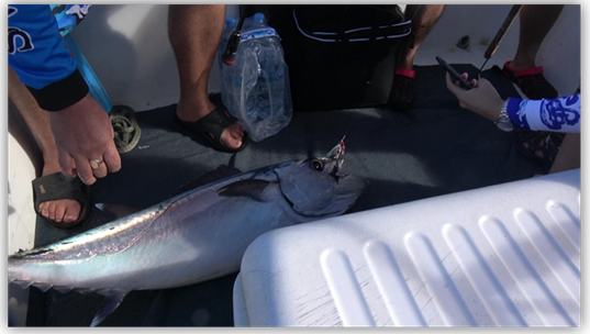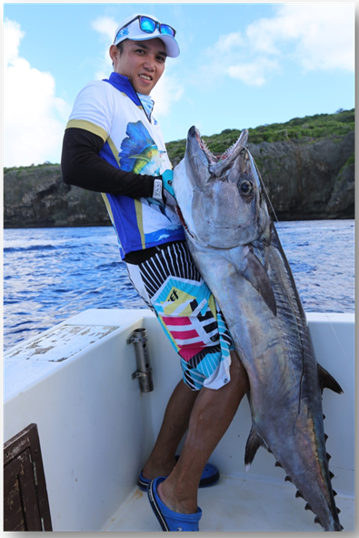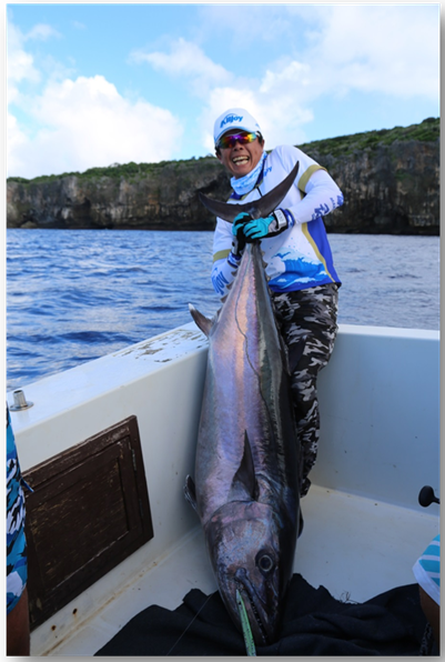 Martin使用歐佳prob53bm短桿、pe5n海釣輪、250g鐵板魚餌俘獲65kg犬齒鮪魚。